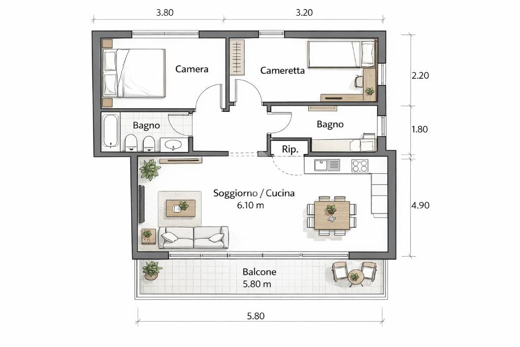 La metratura generosa consente diverse possibilità di ridistribuzione degli ambienti, permettendo di creare spazi moderni e funzionali valorizzando al massimo ogni ambiente.