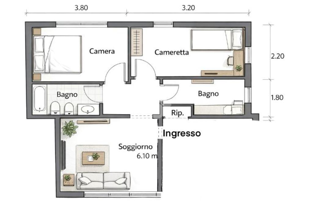 La metratura generosa offre diverse possibilità di riorganizzazione degli spazi interni: l’appartamento può essere mantenuto come ampio bilocale con ambienti comodi e luminosi oppure ripensato con una distribuzione più moderna e funzionale.